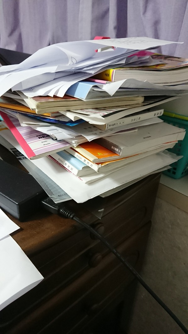 教科書や参考書がいつも山積みになってしまいます……画像は家の机ですが学校の机も同じような感じです……。勉強時間より参考書探す時間の方が長くなったりしてどうにかしないととは思っているんですけど笑